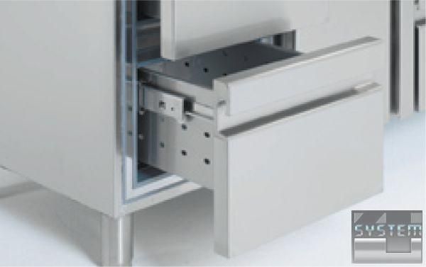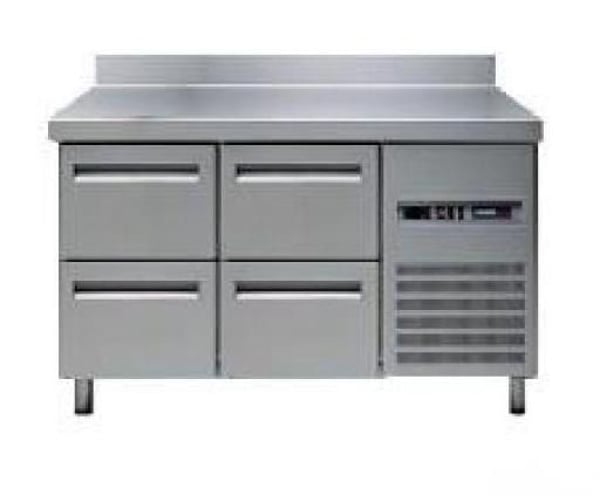 Стол холодильный с четырьмя выдвижными ящиками и бортом 10 см, внутренняя отделка, регулируемые ножки и внешняя часть столешницы с закругленными углами внизу, выполнена из нержавеющей стали, кроме задней панели.