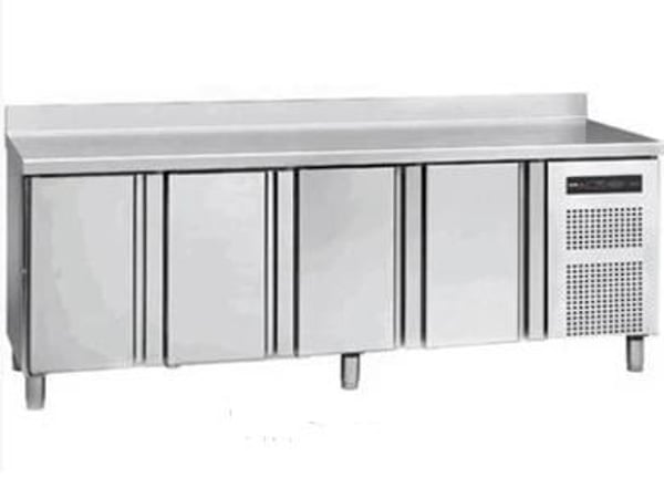 Стол холодильный четырехдверный с задним бортом 6 см, внутренняя отделка, регулируемые ножки и внешняя часть столешницы с закругленными углами внизу, выполнена из нержавеющей стали, кроме задней панели.