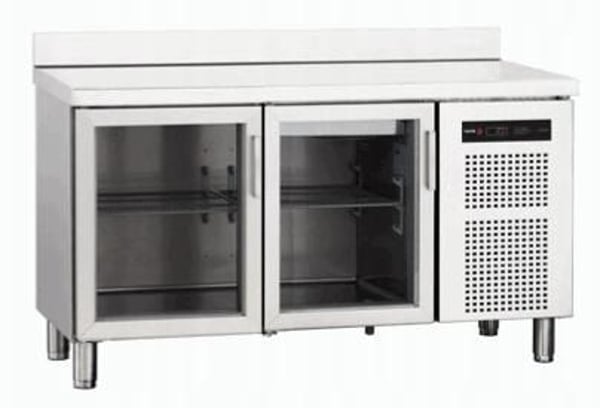 Холодильный стол с задним бортом 10см и со стеклянными двумя дверьми, внутренняя отделка, регулируемые ножки и внешняя часть столешницы с закругленными углами внизу изготовлены из высококачественной нержавеющей стали, устойчивой к низким и высоким температурам, к коррозии и с наилучшим коэффициентом гигиеничности, кроме задней панели.