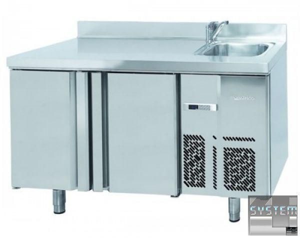 Стол холодильный на 2 двери, столешница с бортом и встроеной ванной моечной, температурный режим -2/+8С, объём камеры 245 л., электронная панель управления, вентилируемая камера с гигиеническим исполнением, авторозморозка, климатический класс +43С, материал исполнения нерж.сталь.