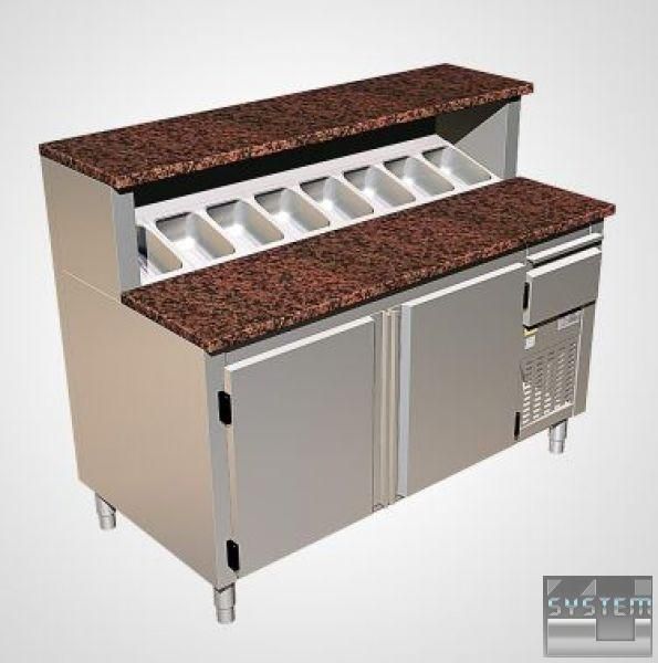 Холодильный стол для пиццы. особенностью является то, что над столешницей имеются гастроемкости для компонентов начинки пиццы.
