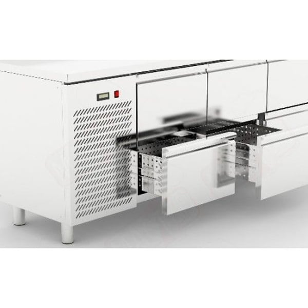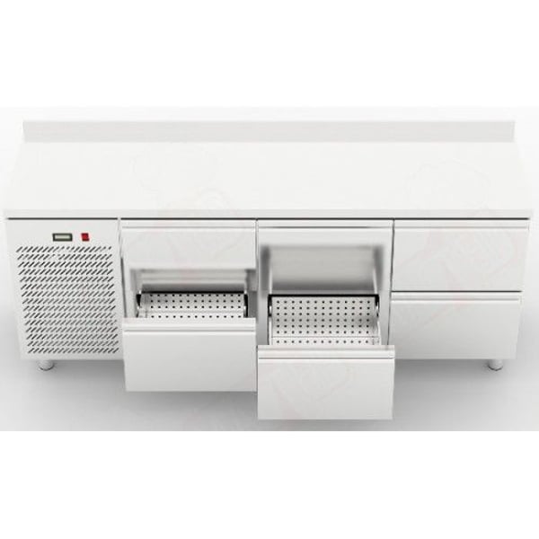 Холодильный стол со встроенными ящиками в стандартном исполнении имеет пристенный борт высотой 50 мм, но может быть изготовлен по желанию и без борта.