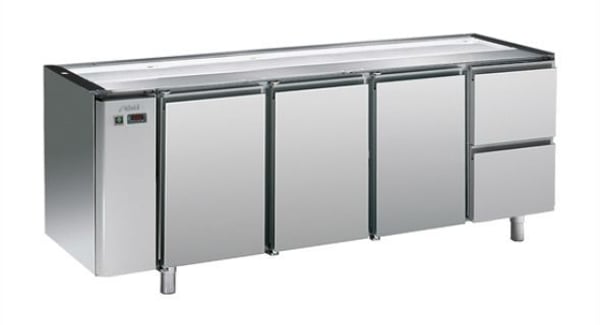 Несущий каркас выполнен из нержавеющей стали AISI 304 . Толщина изоляции 60 мм, она изготовлена из полиуретана без использования CFC. Глубина 70 см - GN 1/1. Рабочий стол высотой 60 мм выполнен из нержавеющей стали AISI 304 с звукопоглощающей разделительной панелью. Предлагаются варианты без рабочего стола, с односторонним рабочим столом, или с односторонним рабочим столом и плинтусом столешницы.