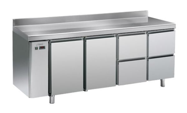 Несущий каркас выполнен из нержавеющей стали AISI 304 . Толщина изоляции 60 мм, она изготовлена из полиуретана без использования CFC. Глубина 70 см - GN 1/1. Рабочий стол высотой 60 мм выполнен из нержавеющей стали AISI 304 с звукопоглощающей разделительной панелью. Предлагаются варианты без рабочего стола, с односторонним рабочим столом, или с односторонним рабочим столом и плинтусом столешницы.