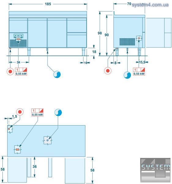 Несущий каркас выполнен из нержавеющей стали AISI 304 . Толщина изоляции 60 мм, она изготовлена из полиуретана без использования CFC. Глубина 70 см - GN 1/1. Рабочий стол высотой 60 мм выполнен из нержавеющей стали AISI 304 с звукопоглощающей разделительной панелью. Предлагаются варианты без рабочего стола, с односторонним рабочим столом, или с односторонним рабочим столом и плинтусом столешницы.