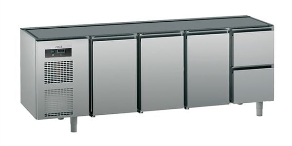 Несущий каркас, выполненный из стали, защищенной от отпечатков пальцев. Толщина изоляции - 60 мм из полиуретана без использования CFC. Глубина 60 см и 70 см - GN 1/1. Рабочий стол высотой 60 мм выполнен из нержавеющей стали AISI 304 с звукопоглощающей разделительной панелью.