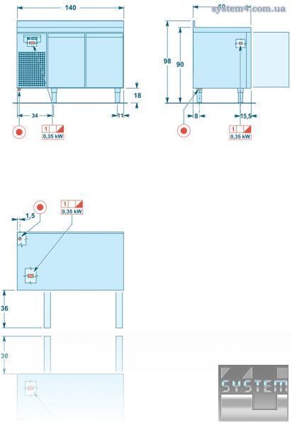 Несущий каркас, выполненный из стали, защищенной от отпечатков пальцев. Толщина изоляции - 60 мм из полиуретана без использования CFC. Глубина 60 см и 70 см - GN 1/1. Рабочий стол высотой 60 мм выполнен из нержавеющей стали AISI 304 с звукопоглощающей разделительной панелью.