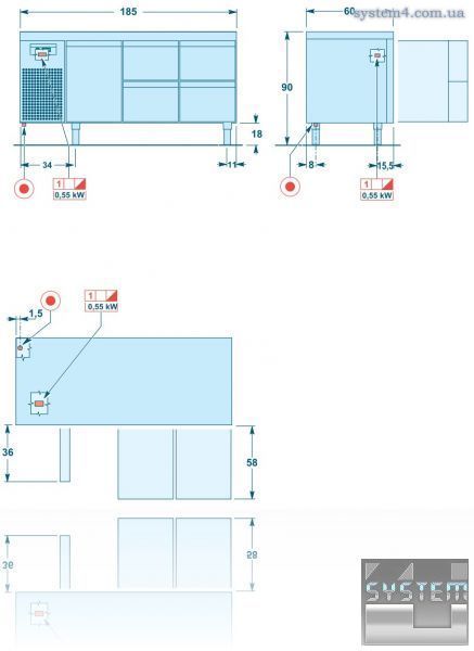 Несущий каркас, выполненный из стали, защищенной от отпечатков пальцев. Толщина изоляции - 60 мм из полиуретана без использования CFC. Глубина 60 см и 70 см - GN 1/1. Рабочий стол высотой 60 мм выполнен из нержавеющей стали AISI 304 с звукопоглощающей разделительной панелью.