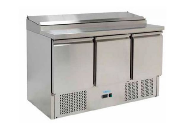 Стол холодильный с тремя распашными дверьми с возвратным механизмом, также подогрев по контуру двери препятствует образования конденсата. Холодильный агрегат находится внизу, охлаждение происходит за счет вентиляции объема рабочей камеры, имеется функция автоматической оттайки.