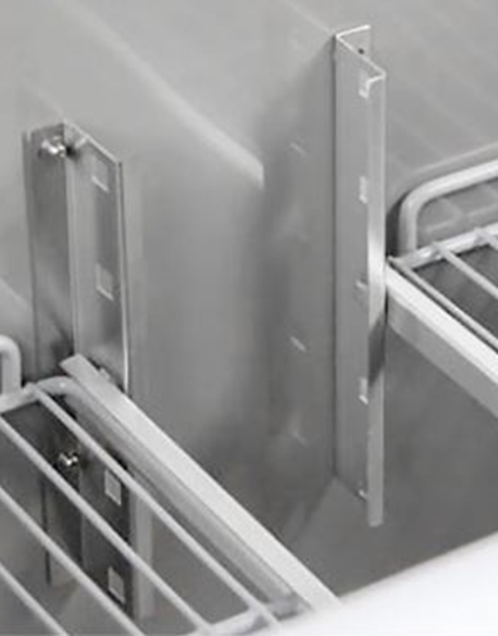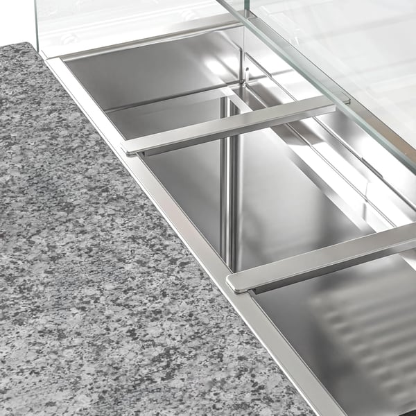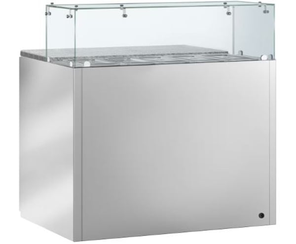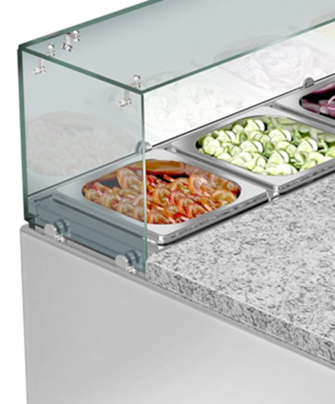 Стеклянную надставку можно использовать в качестве полки для ингредиентов или рабочего инвернтара. 5 x GN 1/6 гастроемкостей, которые охлаждаются и служат витриной, где хранятся начинки.