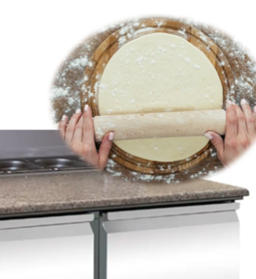 Столешница выполнена из гранита, а каменная поверхность является более прохладной и менее скользкой, что значительно ухудшает работу с тестом. На столешнице обычно готовят тестовое основание для пиццы и укладывают начинку.