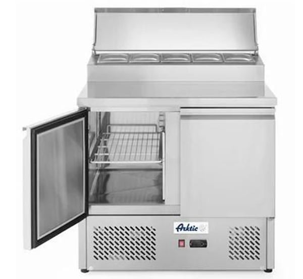 На столешницу, сверху, розмещена специальная надставка под гастроемкости: 5 - GN1/6, Н=150 мм (емкости в комплект не входят) - для быстрого и удобного приготовления салатов, сэндвичей и разнообразных гарниров к блюдам.