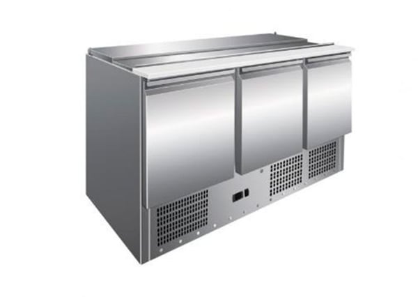 Стол холодильный с тремя распашными дверьми с возвратным механизмом, также подогрев по контуру двери препятствует образования конденсата. Холодильный агрегат находится внизу, охлаждение происходит за счет вентиляции объема рабочей камеры, имеется функция автоматической оттайки.