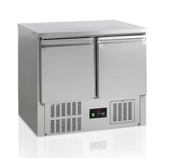 Стол холодильный с двумя распашными дверьми с возвратным механизмом, также подогрев по контуру двери препятствует образования конденсата. Холодильный агрегат находится внизу, охлаждение происходит за счет вентиляции объема рабочей камеры, имеется функция автоматической оттайки.
