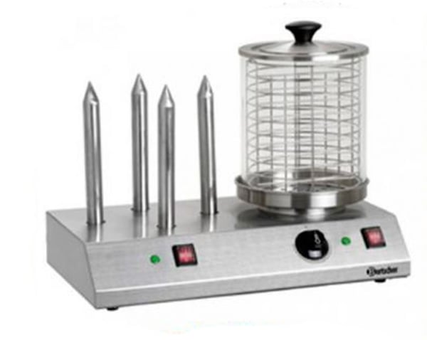 Корпус аппарата и штыри выполнены из высококачественной нержавеющей стали и стеклянная колба, в которой сосиски готовятся на пару, что исключает их разваривание. Четырехштыревой подогреватель сосисок паровой оснащен терморегулятором, ёмкостью для воды (паровой баней) и раздельным нагревом колбы.