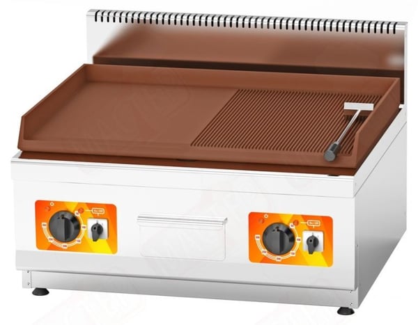 Большая толщина поверхности ( 20 мм.), исключает возможность деформации, и гарантирует равномерное распределение тепла. Задний и боковые борта препятствуют разбрызгиванию горячего жира.