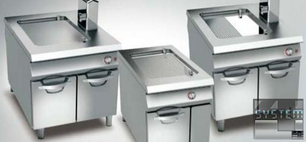Гладкая электрическая жарочная поверхность из жаропрочного сплава (2 слоя: 12мм нержавеющая сталь Fe510D + 3мм пищевая нержавеющая сталь 316L) Angelo Po 06WFT7EV на нейтральном шкафу относится к тепловой модульной линии OMEGA 1100.