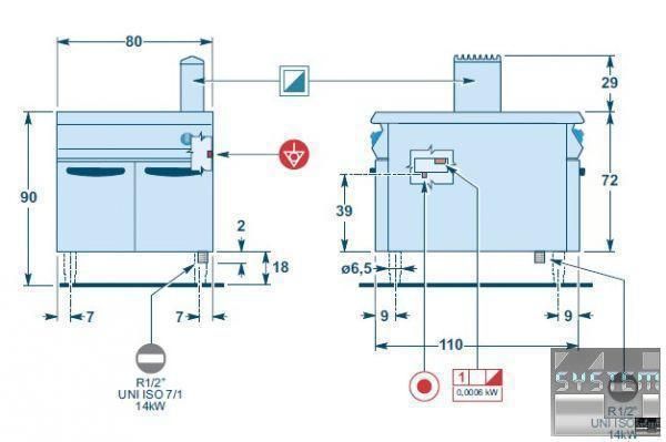 Нагревание посредством тройного пламени огня двух независимых групп горелок из нержавеющей стали, общей мощностью 14 кВт (каждая нагревает половину поверхности 7кВт + 7кВт), контроль термостатическими клапанами управления и датчиками, установленными непосредственно на поверхности.