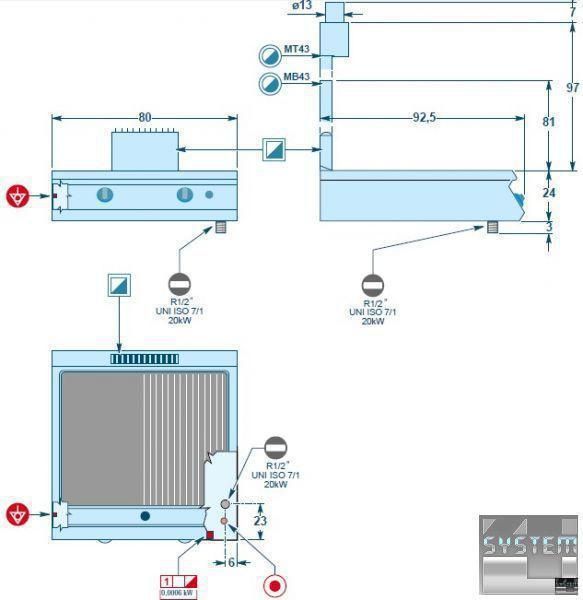 Нагревание посредством двух независимых групп горелок, мощностью 10 кВт каждая, контроль термостатическим клапаном. Каждая группа нагревает половину поверхности.