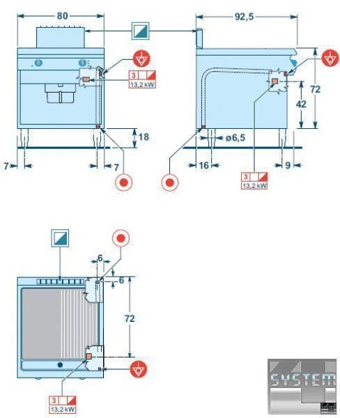 Нагрев происходит благодаря двум группам армированных нагревательных элементов под пластиной из нержавеющей стали AISI 304L и регулируется термостатом. Общая мощность 13,2 кВт (каждая группа нагревательных элементов нагревает половину поверхности 6,6 кВт + 6,6 кВт).