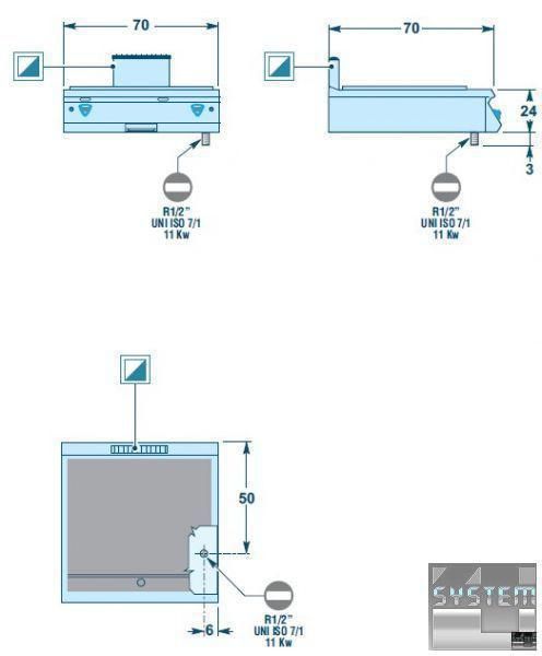 Нагревание посредством двух независимых групп горелок (каждая нагревает половину поверхности) мощностью 11 кВт, контроль термостатическим клапаном.