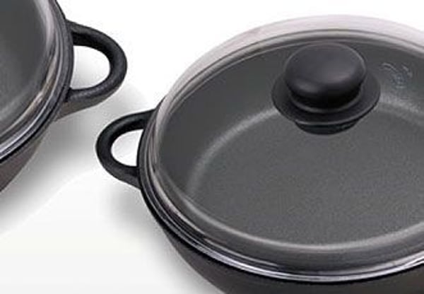 Может быть дополнена стеклянной крышкой Pyrex с ручкой из специального пластика.