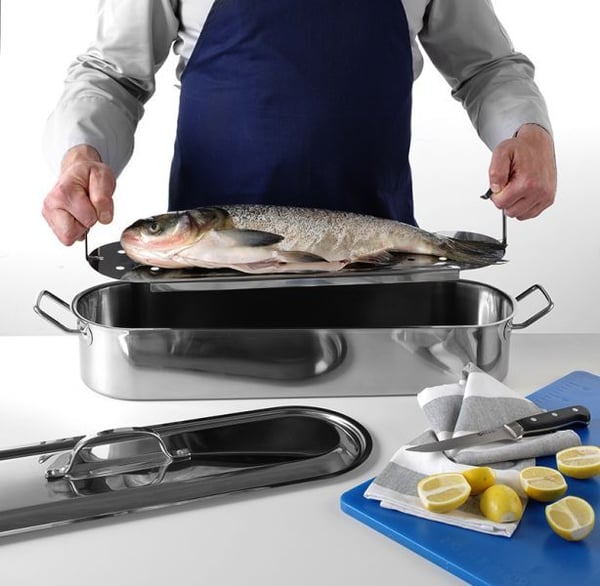 Благодаря внутренней решетке, рыбу удобно помещать в кастрюлю и наоборот, вынимать.