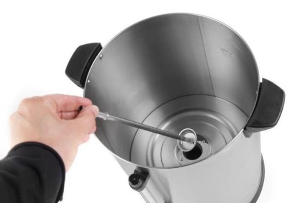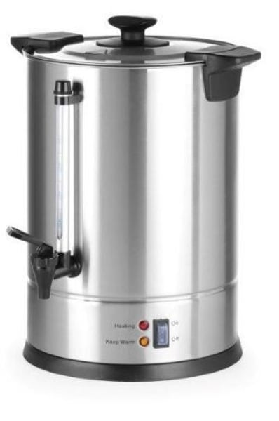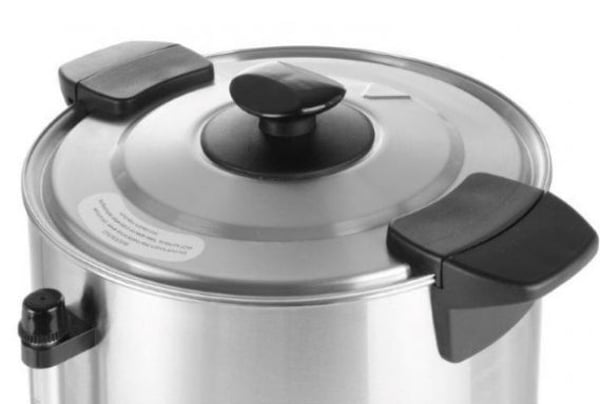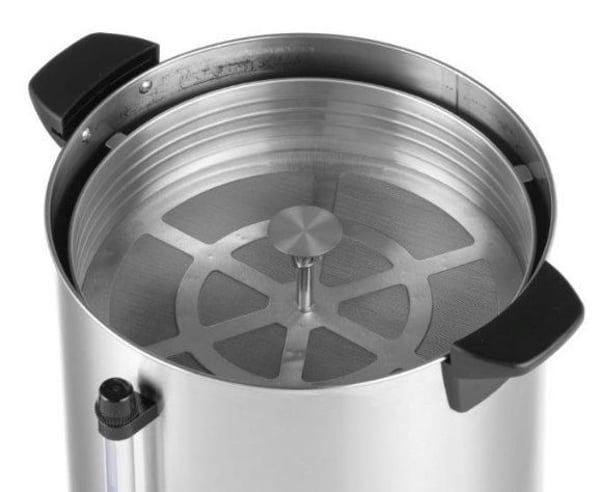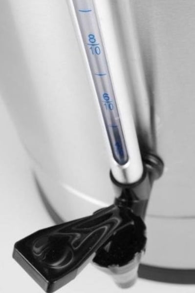 Снаружи кипятильник-кофеварочная машина оснащен мерной шкалой, не капающим краном, сливным поддоном (поддон идет в комплекте) и механической панелью управления.
