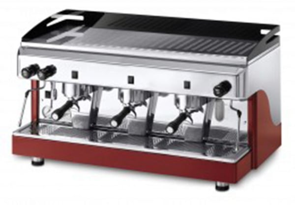 Полуавтоматическая трехрожковая кофемашина. Корпус кофемашины выполнен из нержавеющей и окрашенной стали. Котел и патрубки - медные. Две паровые палочки. Двойной датчик для бойлера и насоса давления. Индикатор освещения включенной машины. Смотровой индикатор количества воды в бойлере, функция автоматического пополнения воды, встроенная моторная помпа? полный контроль дозирования электромеханической пробкой.
