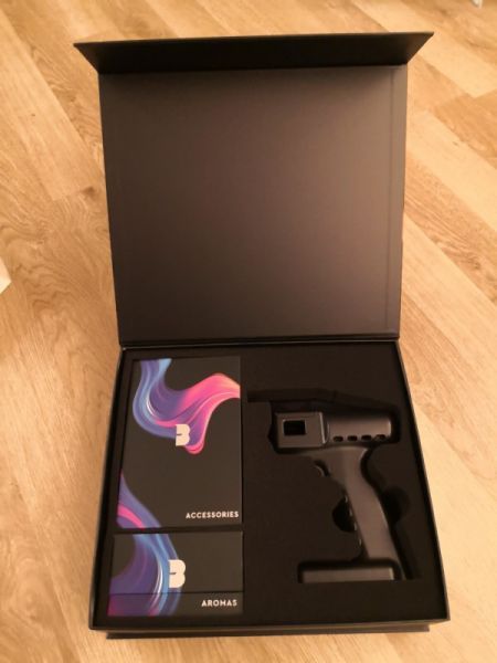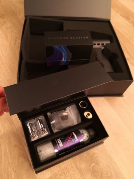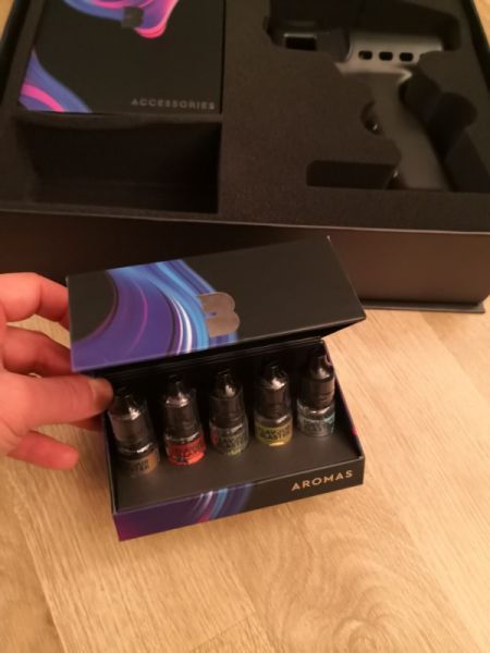 Пистолет-бластер Flavour Blaster заряжается через USB-шнур и имеет магнитный резервуар для наполнения желаемым ароматом. Устройство нагревает содержимое емкости, образуя пар.