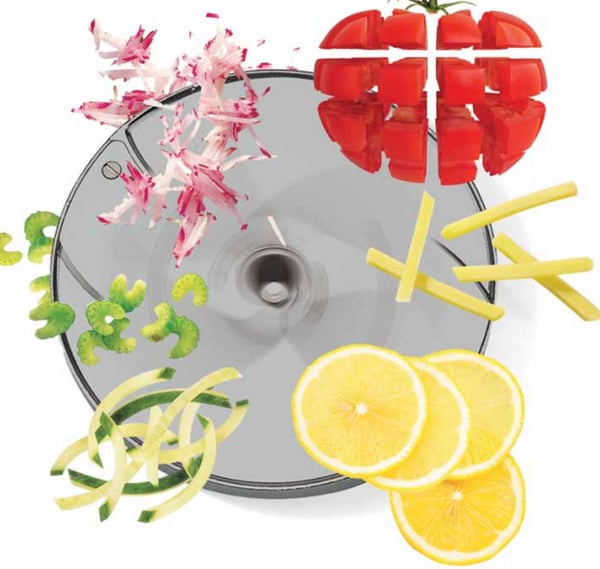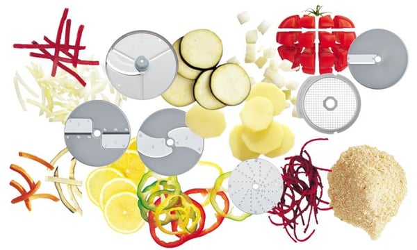 Комплект для нарезки различных видов ингредиентов, включая фрукты и овощи. Форма дисков выбирается в зависимости от задачи, поэтому можно нарезать, измельчить, либо нарезать соломкой или кубиками любые продукты.