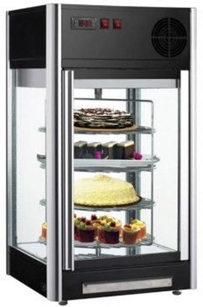 Витрина предназначена для хранения и демонстрации различных кондитерских и пищевых изделий, десертов, выпечки, и напитков. Устройством витрины предусмотрены четыре вращающиеся хромированные полки, LED - подсветка и цифровой регулятор температуры.