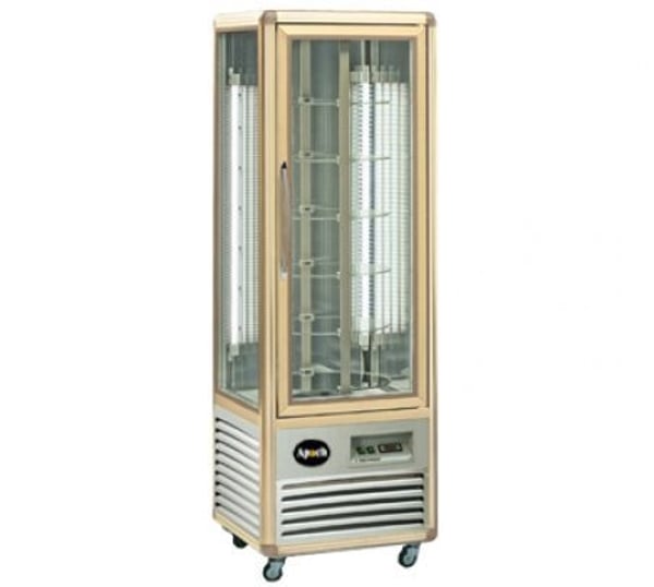 Данная модель имеет очень стильный вид, а практичность в использовании позволит установить его в любом кафе, ресторане или кондитерском магазине. Модель изготовлена из качественного алюминия, частично окрашенного в бронзовый цвет. Основа оборудована колесиками, для легкости перемещения. С четырех сторон стекло, для лучшей обзорности. Две распашные дверцы, обеспечивают надежную термоизоляцию и удобство доступа к продукту. В средине шкаф оборудован шестью вращающимися полками. Диаметр каждой - 430 мм. Яркая внутренняя подсветка. Динамическая система охлаждения обеспечит равномерное распределение холода по всем полкам.