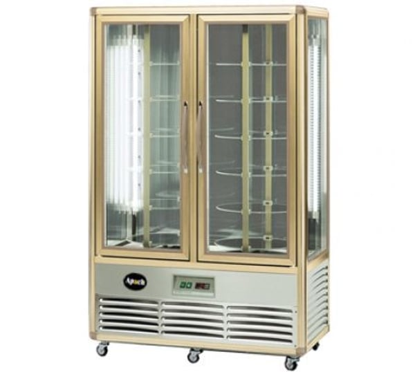 Данная модель имеет очень стильный вид, а практичность в использовании позволит установить его в любом кафе, ресторане или кондитерском магазине. Модель изготовлена из качественного алюминия, частично окрашенного в бронзовый цвет. Основа оборудована колесиками, для легкости перемещения. С четырех сторон стекло, для лучшей обзорности. Две распашные дверцы, обеспечивают надежную термоизоляцию и удобство доступа к продукту. В средине шкаф оборудован 12-ю круглыми полками. Диаметр каждой - 430 мм. Яркая внутренняя подсветка. Динамическая система охлаждения обеспечит равномерное распределение холода по всем полкам.