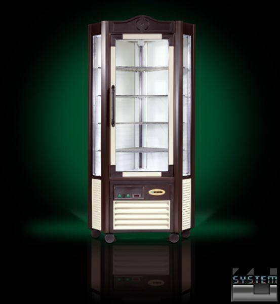 Витрина охлаждаемая вертикальная низкотемпературная односекционная угловая с фигурной верхней панелью черного цвета со стороны дверцы, 4 охлаждаемыми решетчатыми полками имеет трехстороннее остекление, 2 зеркала с внутренней стороны угла, 1 дверь и 5 колес. Витрина оснащена статической системой охлаждения, тип компрессора Danfoss SC15CL. Рабочая температура - -5С/-20С. Объем - 330 л. Витрина подходит для хранения мороженого, десертов, тортов. Температура окружающего воздуха - до +33С.
