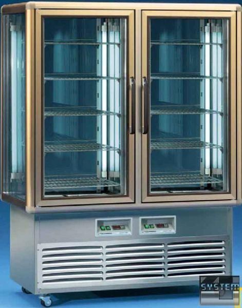 Шкафы выполнены из профильного алюминия. Стеклянные стенки и двери из стеклопакетов обеспечивают хорошую теплоизоляцию и всесторонний обзор внутреннего объема. Применены подсветка и принудительное охлаждение.