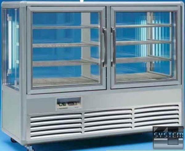 Шкаф выполнен из профильного алюминия. Стеклянные стенки и двери из стеклопакетов обеспечивают хорошую теплоизоляцию и всесторонний обзор внутреннего объема. Применены подсветка и принудительное охлаждение.