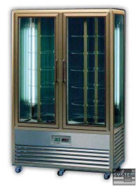 Шкафы выполнены из профильного алюминия. Стеклянные стенки и двери из стеклопакетов обеспечивают хорошую теплоизоляцию и всесторонний обзор внутреннего объема. Применены подсветка и принудительное охлаждение.