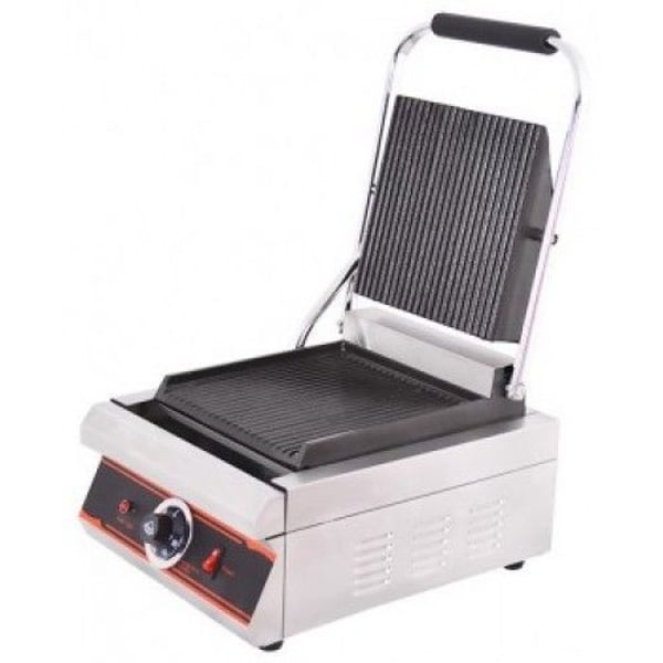 Время разогрева гриля до рабочего состояния 20 минут.. За счет регулирования прижима, можно приготовить блюдо любой толщины. С лицевой стороны панели установлен терморегулятор, что позволяет выбрать степень нагрева гриля от +50 до +300°С. Размер рабочей поверхности 230х240мм, выполнена она из чугуна, корпус изготовлен из нержавеющей стали. Ручки электрического гриля выполнены из термостойкого материала. Гладкая поверхность, съемный поддон для сбора лишнего жира. Чистить гриль очень легко с помощью пищевой металлической щетки.