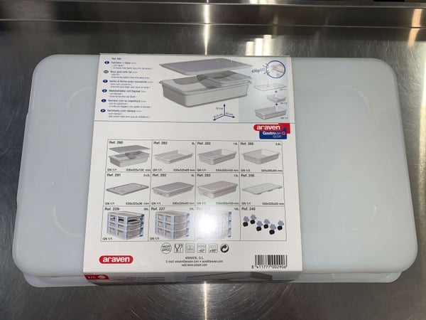 Пищевая емкость GN 1/1 Araven также включает в себя цветные клипсы, с помощью которых можно управлять пищевыми продуктами и на большой вплавленной этикетке гастроконтейнера ставить метки для отслеживания. Это позволяет специалисту на профессиональной кухне идентифицировать содержимое и сохранить информацию, связанную с его происхождением.
