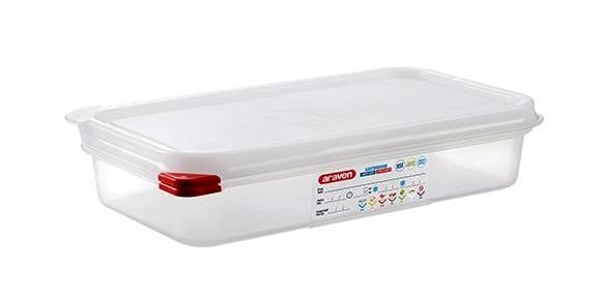Пищевая емкость GN 1/3 Araven также включает в себя цветные клипсы, с помощью которых можно управлять пищевыми продуктами и на большой вплавленной этикетке гастроконтейнера ставить метки для отслеживания. Это позволяет специалисту на профессиональной кухне идентифицировать содержимое и сохранить информацию, связанную с его происхождением.