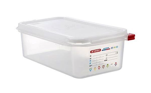 Пищевая емкость GN 1/3 Araven также включает в себя цветные клипсы, с помощью которых можно управлять пищевыми продуктами и на большой вплавленной этикетке гастроконтейнера ставить метки для отслеживания. Это позволяет специалисту на профессиональной кухне идентифицировать содержимое и сохранить информацию, связанную с его происхождением.