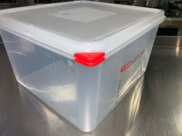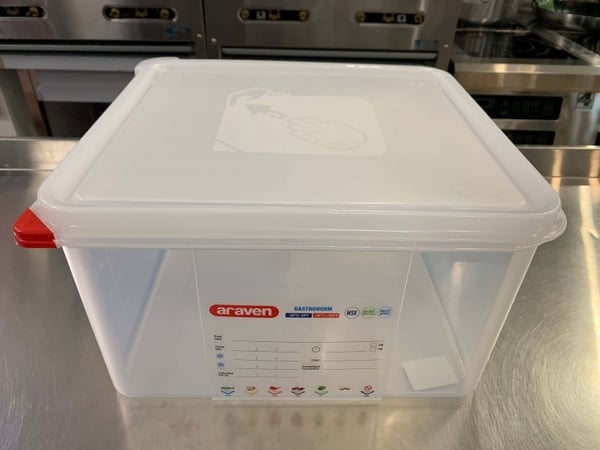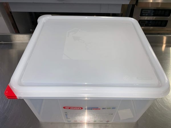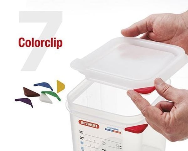 Пищевая емкость GN 2/3 Araven также включает в себя цветные клипсы, с помощью которых можно управлять пищевыми продуктами и на большой вплавленной этикетке гастроконтейнера ставить метки для отслеживания. Это позволяет специалисту на профессиональной кухне идентифицировать содержимое и сохранить информацию, связанную с его происхождением.
