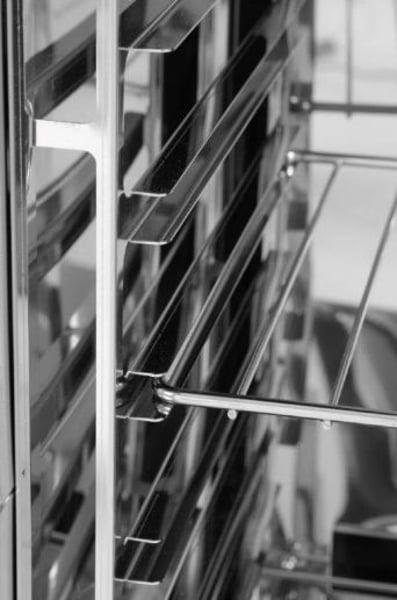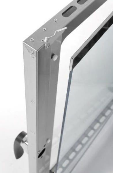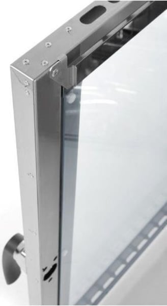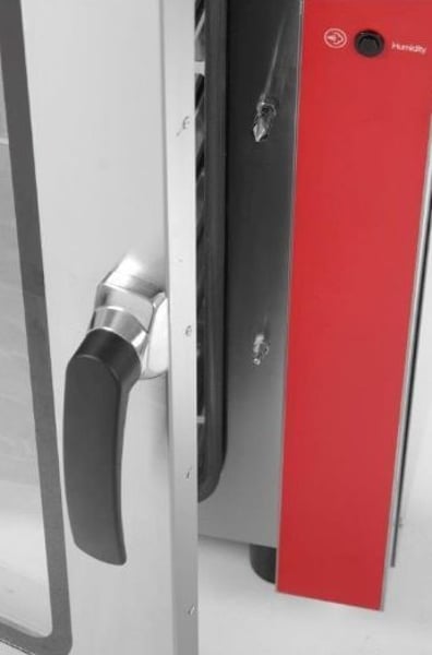 Дверь оснащена двойным стеклом (толщина каждого 4 мм) и съемным уплотнителем двери, которое обеспечивает хорошую теплоизоляцию, а также стеклянная дверь и внутренне освещение позволяют наглядно определить степень готовности выпекаемого изделия без открывания дверцы, тем самым сохраняя внутренний температурный режим. В дверь встроен специальный микровыключатель, который, при открытии дверного проема, способствует остановки подачи пара.