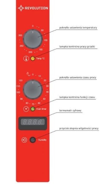 Конвекционная мини печьоснащена цифровой панелью управления, на которой предусмотрены регуляторы температуры и пароувлажнения, и таймер. Все выполняемые функции отображаются световыми индикаторами