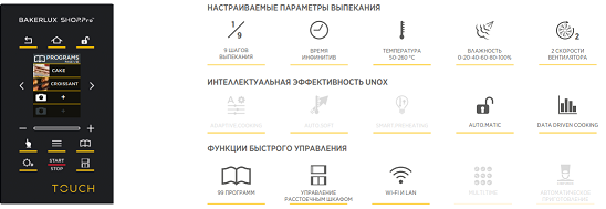 Простая в использовании панель управления TOUCH позволяет самостоятельно регулировать степень влажности, температуру и время выпекания, а встроенная память на 99 программ обеспечивает максимально стабильный результат для каждого изделия.