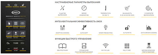 • ADAPTIVE.Cooking™ - адаптація параметрів випічки до фактичного завантаження. Додаткові датчики реагують на зміну температури, оцінюють кількість продукту та автоматично регулюють параметри випікання, адаптують час та температуру випічки до дійсної потреби, гарантуюючи однаковий результат.