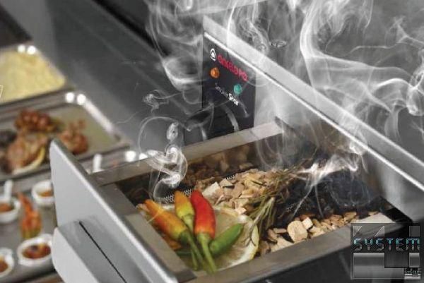 Дымогенератор состоит из контейнера, куда помещаются щепки (замоченные), регулятор, в задней части – трубка с муфтами, эта трубка подсоединяется к всасывающей трубке пароконвектомата AngeloPo.