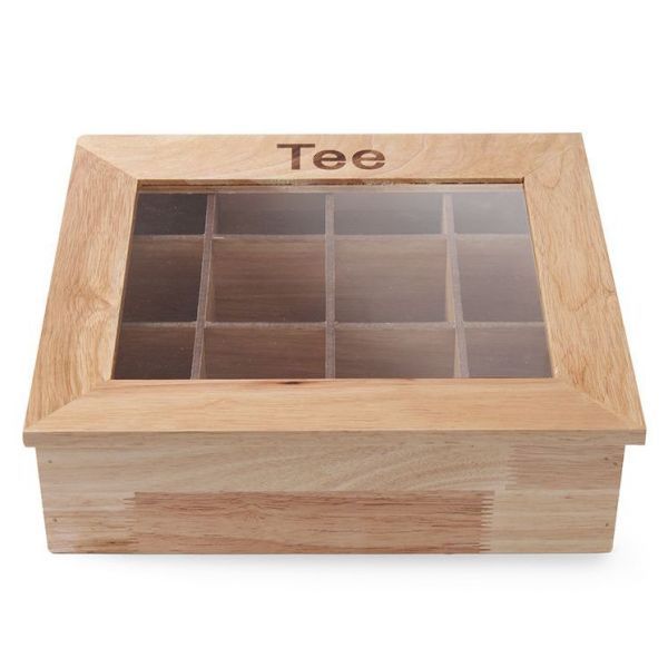 Коробка для чая, имеет 12 перегородок. На крышке расположено смотровое окошко. Материал - дерево.