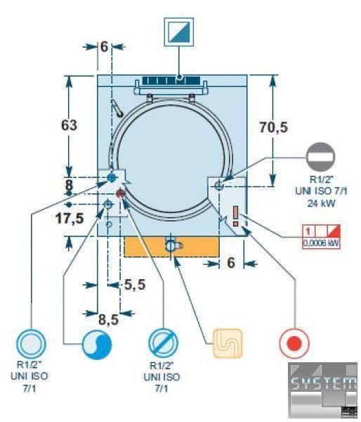 Нагрев прямого типа, создаваемый двумя независимыми группами горелок (12 + 12 кВт) из нержавеющей стали с оптимизированным сгоранием, с предохранительным клапаном, оснащенным термопарой, и защищенным пилотным огнем.